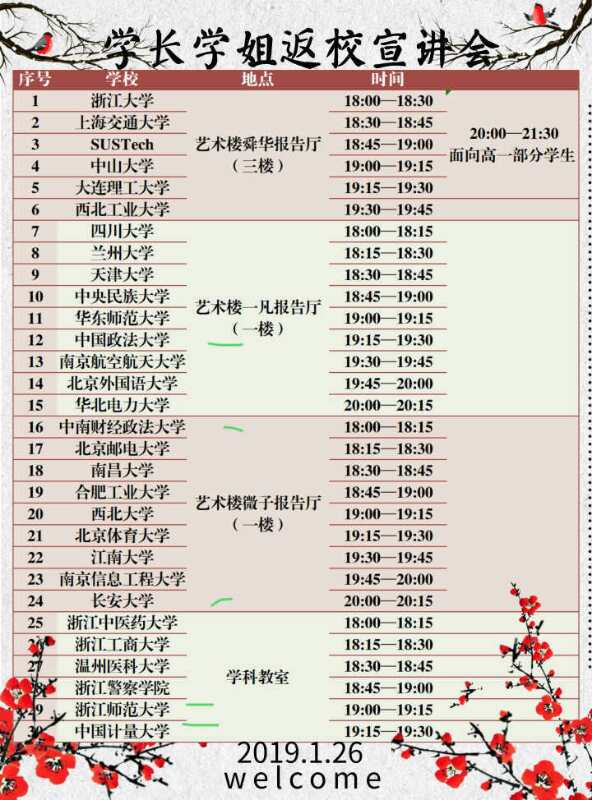 两位同学均毕业于浙江省桐庐中学,该校自浙江省高考改革以来就非常注重向高三学子们宣传各大高校的基本情况以及招生政策,同时也十分支持已毕业的学子们进行寒假实践活动,因此早在2018年的12月24日,浙江省桐庐中学就选定了此次返乡宣讲活动的总负责人,并且建立了“回访母校计划负责人”qq交流群,以便于及时发布消息与联系沟通。在此次活动中,有来自30所高校的学生团队进行宣讲,经过讨论与协商,学校最终确定于2019年1月26日18时在学校报告厅开展返乡宣讲活动。来自Beat365正版唯一官网必一的“西北偏北”宣讲队被安排于26日晚七点开展宣讲。