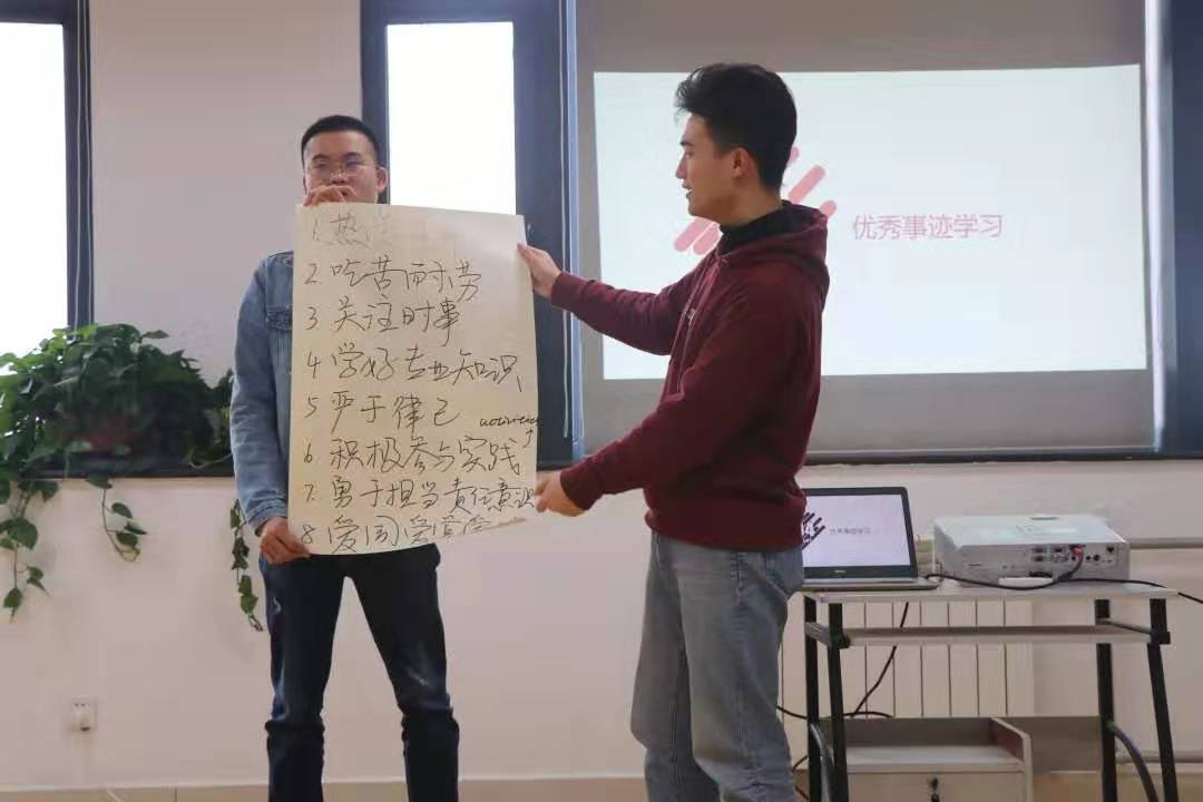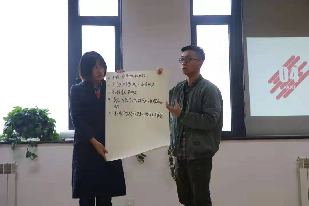 讨论结束后,同学们纷纷将自己小组的成果进行展示并和大家一同交流分享——青年团员能做哪些事情向优秀党员看齐。