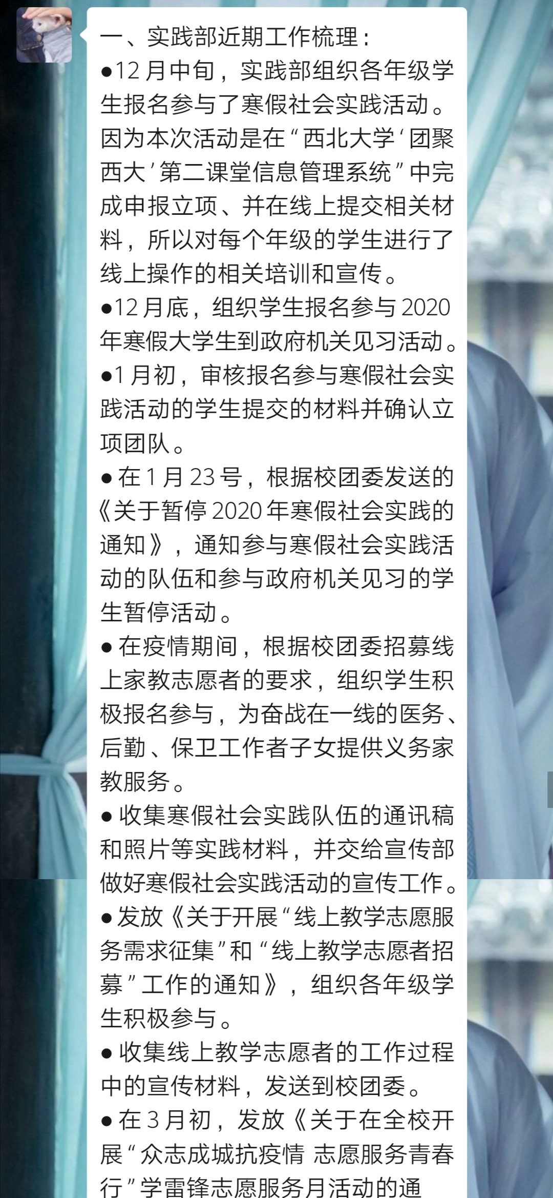 2020年3月11日,Beat365正版唯一官网必一团委召开了线上工作会议,会议讨论了疫情期间团工作如何开展。院团委书记李鑫老师、院团委副书记汪真诚同学出席了此次会议,参加会议的有院团委各部门委员,会议由汪真诚同学主持。