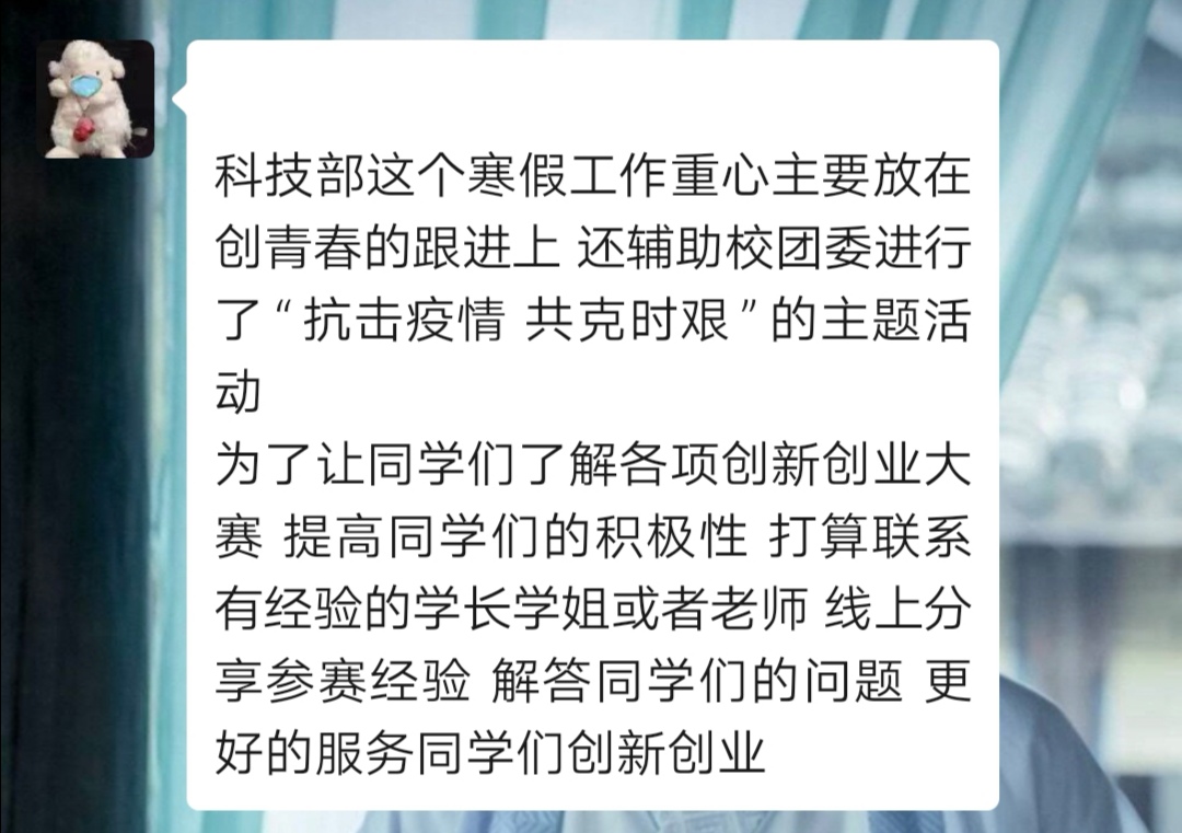 首先,汪真诚同学就疫情期间的团委工作进行概括性发言。其次,团委各委员依次对部门在疫情期间开展的工作内容作出详细汇报,并提出工作中的困难阻力。同时,委员们依据校团委的工作方案提出了本部门在新学期中可以开展的创新性活动。期间,李鑫老师以及汪真诚同学根据各部门的汇报及现实情况分别进行了点评,各部门之间也就具体问题及时交流、共同献策,会议气氛热烈。