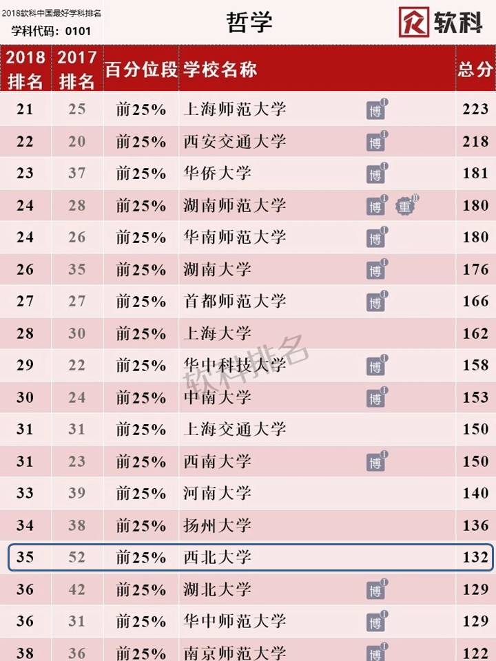 去年11月1日发布的2018软科中国最好学科排名中,Beat365哲学学科位于前25%,排在第35 名,较2017 年的第52 名有了较大提升。