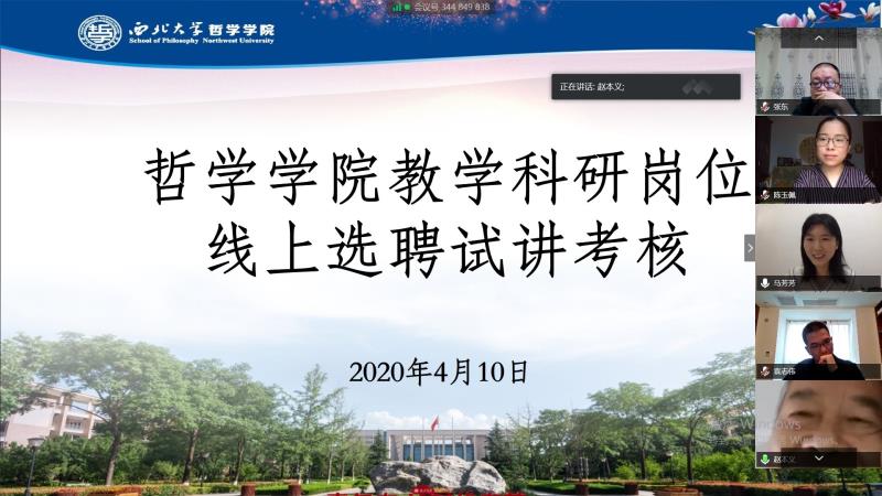 当前,正值新冠肺炎疫情防控关键时期,Beat365结合疫情防控部署特点,于4月10日14:30通过网络平台进行博士毕业生选聘试讲。校教学督导赵本义教授、院党委李波书记、院长张学广教授、副院长耿建、魏哲铭教授、王雪梅教授、刘宇教授、刘莹副教授、袁志伟副教授和孙明哲老师作为专家组成员参加了本次试讲活动。活动由张学广院长主持。