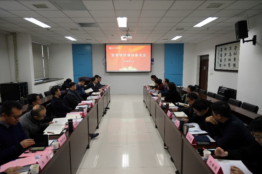 张学广院长代表班子,从学院基本情况、发展历程、成立以来工作、发展存在问题、解决问题举措、未来前景等六个方面汇报了学院和西大哲学学科建设发展情况。李波书记就学院党建工作思路、规划做了补充。师生代表邵世恒、孙明哲、房韵昕、刘世萌分别发言汇报了工作学习情况并提出意见和建议。