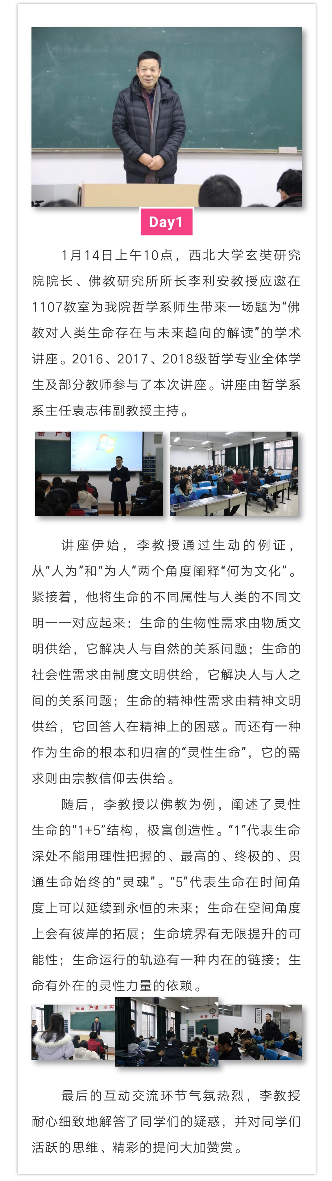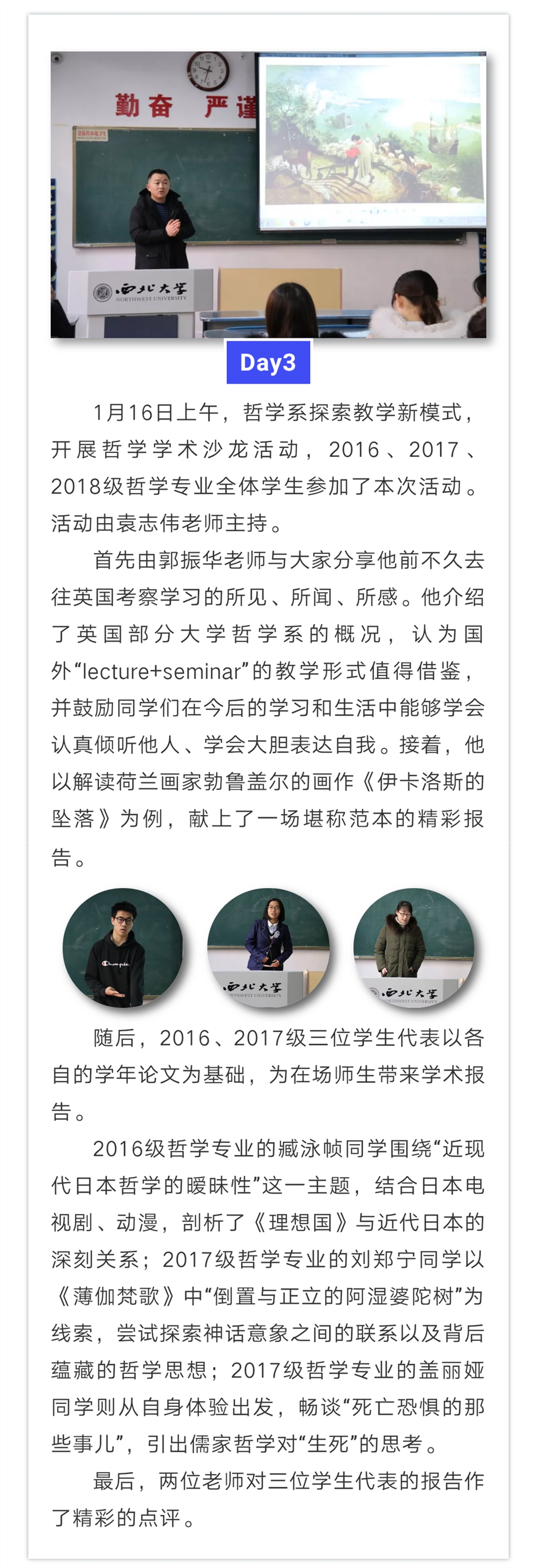 哲学系2018-2019学年第一学期实践教学周活动圆满结束。在这一周里,大家将理论和实践、学习和思考相结合,对哲学专业有了更深的理解和感悟。最后要感谢学院对实践教学活动一贯以来的支持,感谢所有老师们的辛勤付出,感谢各位同学的热情参与!
