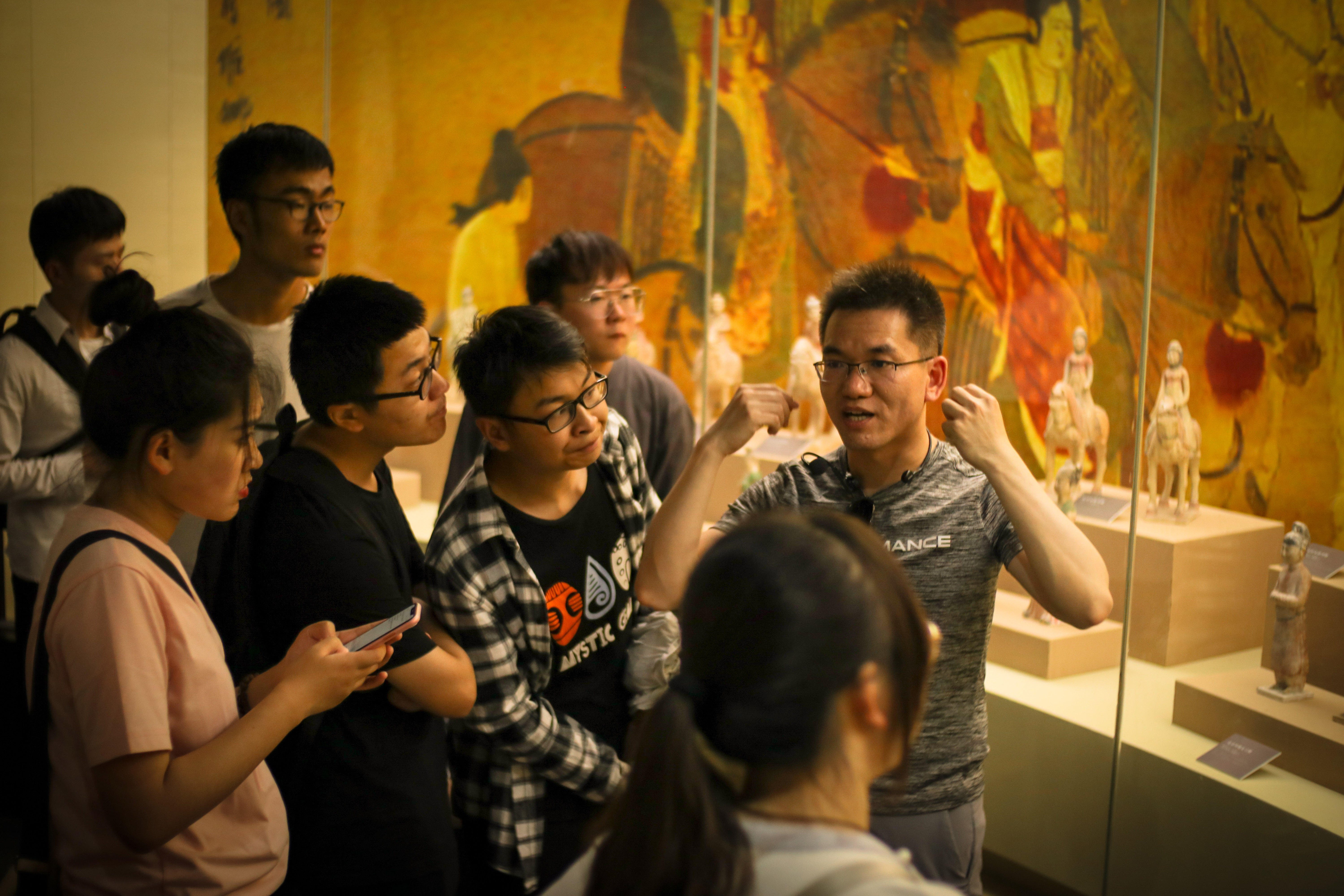 在昭陵博物馆内,大家观赏了李贞、安元寿等墓出土的唐三彩,李勣墓出土的“三梁进德冠”,极为珍贵的李勣墓《歌舞图》,尉迟敬德墓志盖的“飞白书”等等文物。这些文物体现了初唐独特的美学风格,反映了当时丝绸之路的盛况,折射出中国各民族的大融合。