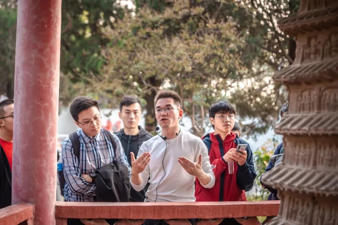 最后一站的药王大殿,是集中展现中国古建筑之美的宝地。飞檐一揽冲天,斗拱精雕细刻,塔式祭台、对狮护法,尽显传统建筑文化的魅力。这里也有丰富的历史文化内涵,石碑上记载着《千金方》等重要文献资料,袁老师为同学们仔细讲解了一尊魏晋时期的石塔雕刻,虽然同时期的木塔皆已毁坏,今人仍然可以通过这尊石塔来感受其建筑之美。