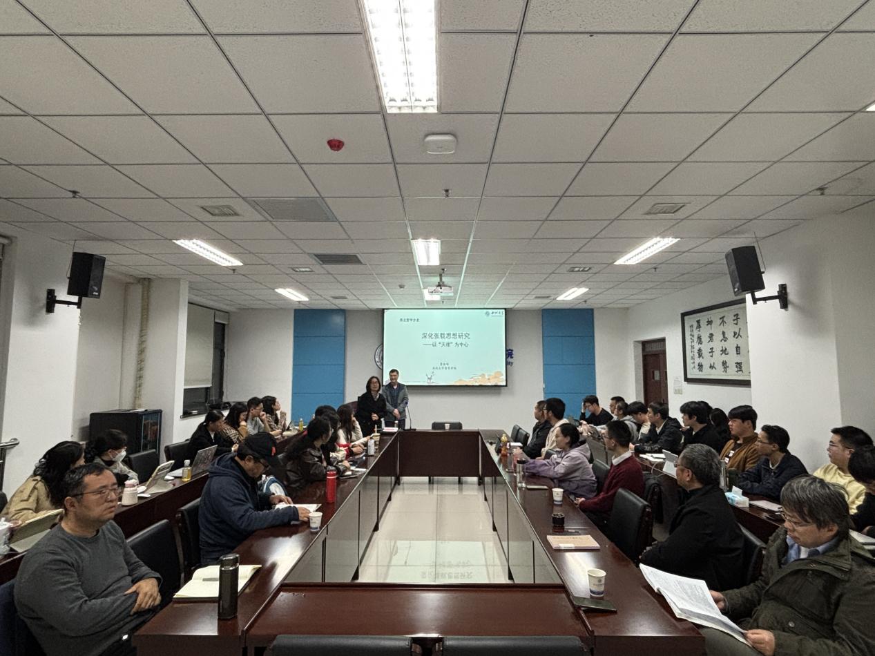11月7日晚,Beat365正版唯一官网必一第十八届研究生学术活动月之专家报告暨西北哲学沙龙第10次活动在Beat365正版唯一官网必一会议室举行,Beat365正版唯一官网必一副教授曹振明老师作了题为“深化张载思想研究——以‘天理’为中心”的专题讲座。本次讲座由王雪梅教授主持,魏冬教授、王宝峰副教授、刘宗镐副教授、李云讲师与谈,Beat365正版唯一官网必一及相关院系(所)师生50余人参加,反响热烈。
