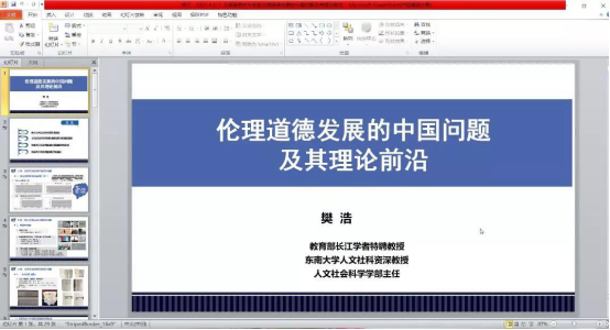 樊教授根据自己以往的调查研究所获得的数据和结果,以及东南大学关于伦理道德发展研究所做的努力,就“西方学术走向与中国学术战略”、“认同回归共识与现代伦理型文化的自觉自信”、“转型共识与伦理道德的中国精神哲学形态”、“发展共识与伦理道德的文化自立”四个方面围绕主题为大家进行了深入浅出的讲解,并且重点剖析了“如何对待西方学术潮流”、“如何发现理论前沿”这两个问题。