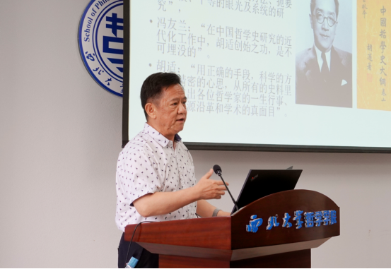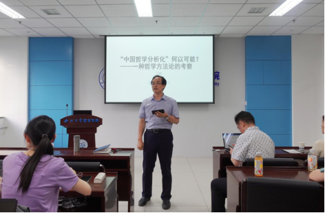 讲座伊始,江怡教授介绍了“中国哲学分析化”这一课题的由来。他认为这两者其实是“体”与“用”的关系,以中国哲学为主体,用分析的方法去化解中国哲学问题。在问题性质方面,江怡教授引用了胡适等学者在此方面的研究,并对其进行了辩证式批判。
